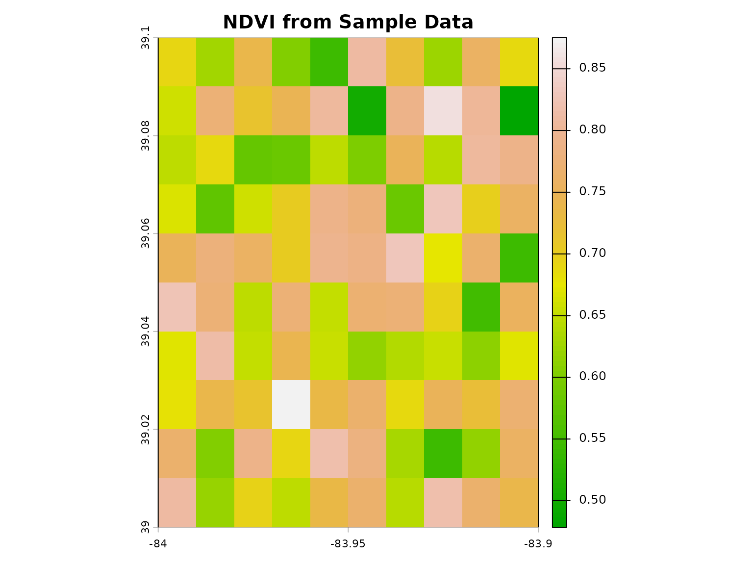 plot(ndvi, main = "NDVI from Sample Data", col = terrain.colors(100))